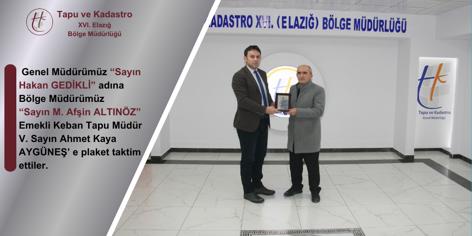 Bölge Müdürlüğümüze bağlı Keban Tapu Müdürlüğümüzde Tapu Müdür Yrd. ve Vekili olarak görev yapmakta iken emekli olan Sayın Ahmet Kaya AYGÜNEŞ’ e Genel Müdürümüz Sayın Hakan GEDİKLİ adına Bölge Müdürümüz Sayın Muhammed Afşin ALTINÖZ tarafından kendilerine plaket taktim edilmiştir...