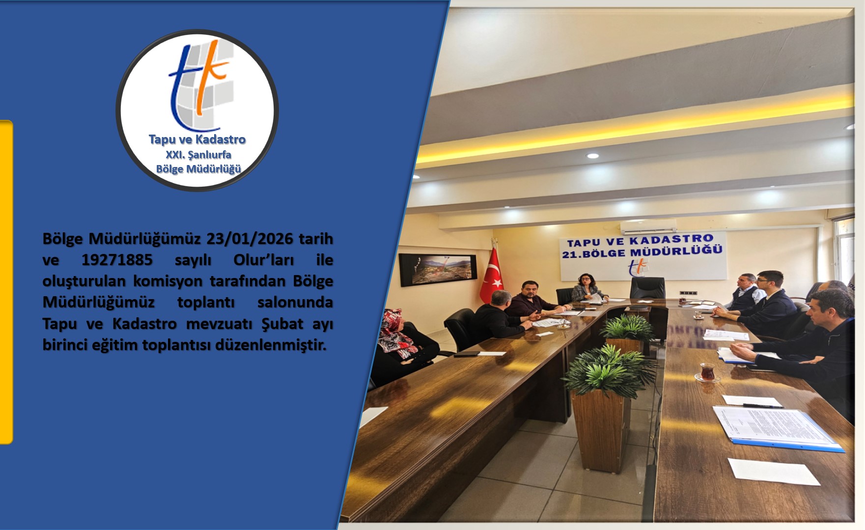 Tapu ve Kadastro Müdürlüklerimizde görev yapan personelin nitelik, bilgi, beceri, tutum ve davranış olarak geliştirilmesine yönelik olarak planlanan 2026 Ocak ayı ''Yüz Yüze Eğitimleri'' Bölge Müdürlüğümüze bağlı Tapu ve Kadastro Müdürlüklerimizce yapılmıştır...
