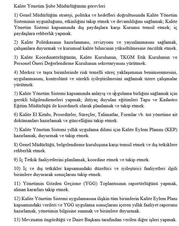 Kalite Yönetim Şube Müdürlüğü Görevleri