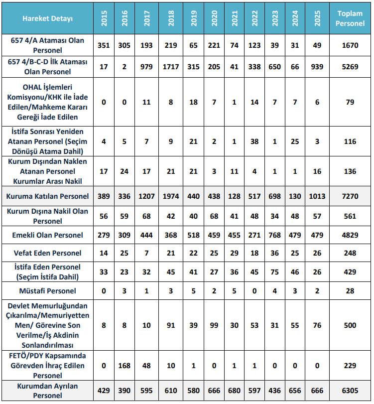 PERSONEL HAREKETLERİ (2015 - 2025)Tapu ve Kadastro Genel Müdürlüğü'nün (TKGM) 2015 -2025 yılları personel hareketleri aşağıdaki tabloda yer almaktadır.(31.12.2025 tarihinde güncellenmiştir.)
