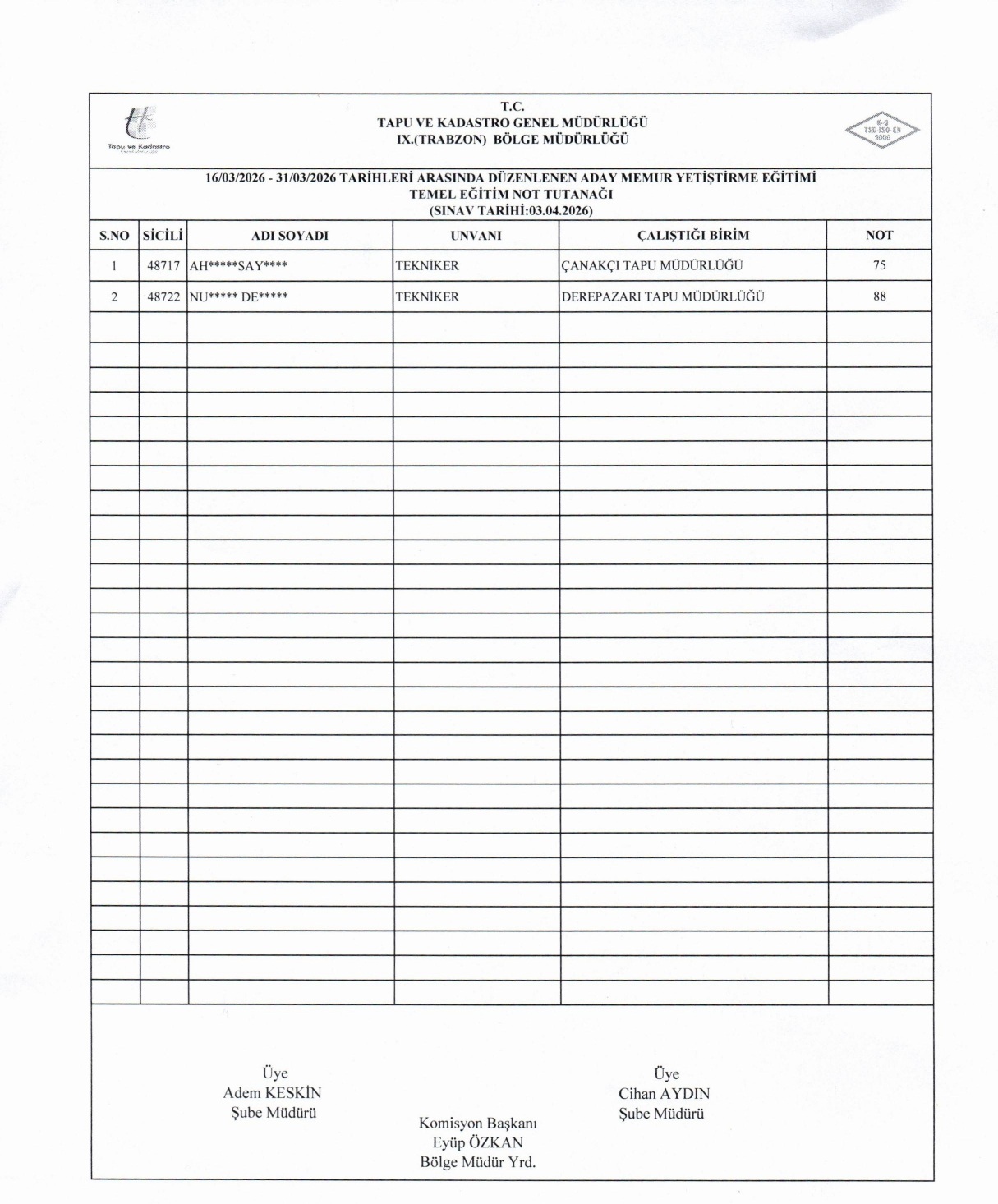 Bölge Müdürlüğümüze bağlı müdürlüklerde görev yapan aday memurlara yönelik 16.03.2026 - 31.03.2026 tarihleri arasında düzenlenen Aday Memur Yetiştirme Eğitimi sonunda 03.04.2026 tarihinde yapılan Eğitim Sınav Sonuçları açıklanmıştır.